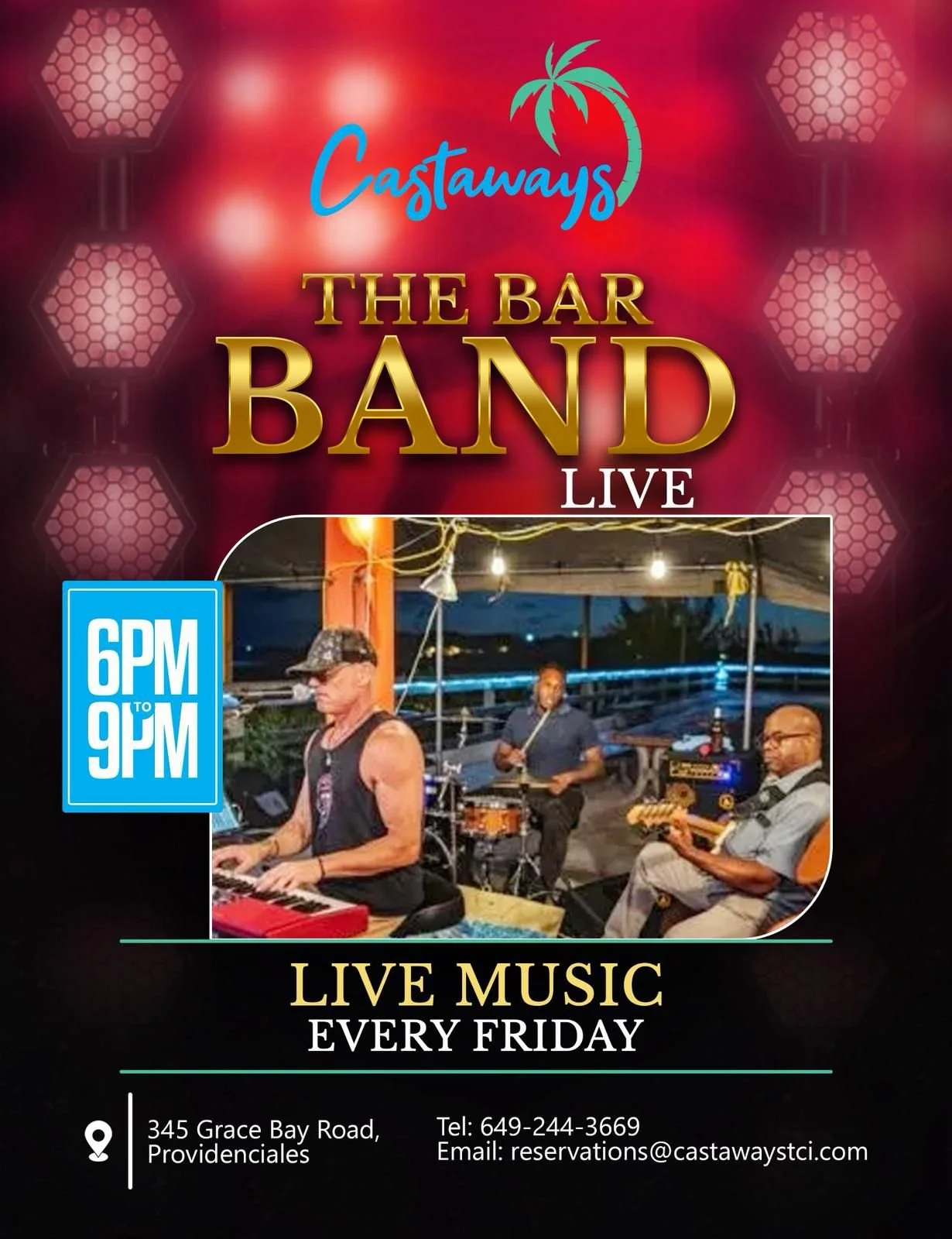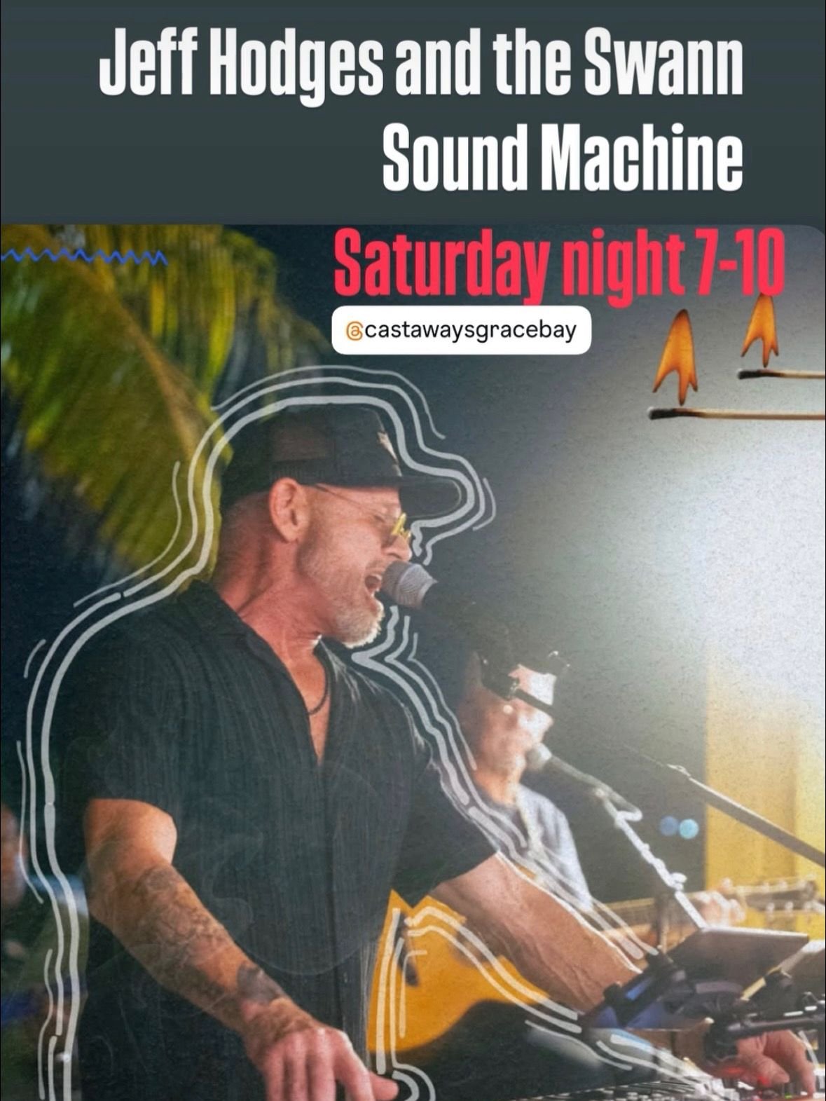 The current lineup features Bob Hawkins on lead guitar, David Hartshorn on vocals and acoustic guitar, Jeff Hodges on vocals and keyboard, Brian Swann on bass, and Donovan Swann on drums. Their high energy performance attracts a loyal following of locals and will delight visitors who are looking for a fun night of music under the palms in Grace Bay!